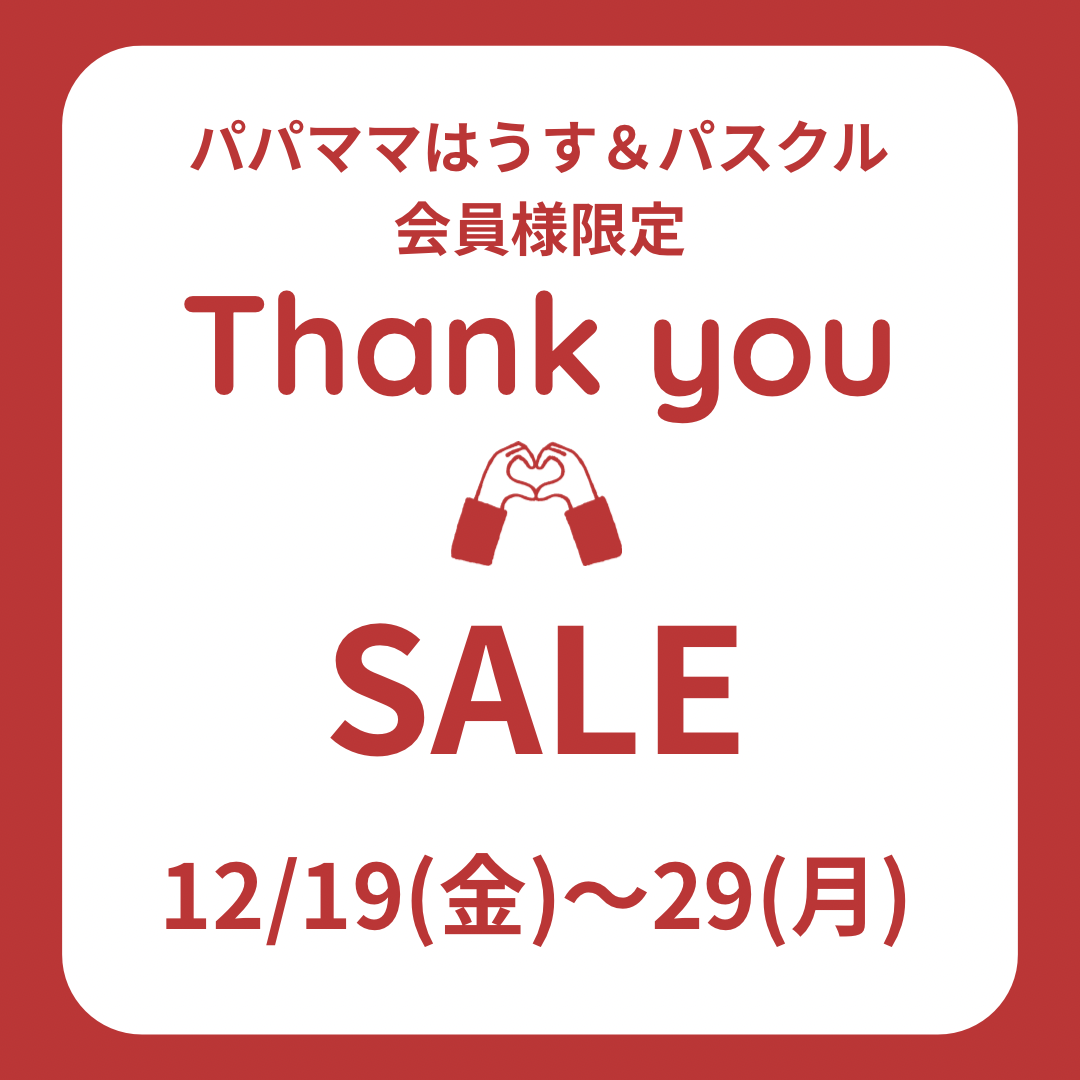 今年も一年ありがとうを込めてパパママはうす&パスクル会員様限定 thank you SALEを開催します。 12/19(金)〜29(月) 冬物衣類30%OFF 大型商品、おもちゃ、雑貨等、パスクル商品 10%OFF ※ハンドメイド商品、レンタル衣装、パスクルネットはセール対象外 ・お買い上げの際会員カードの ご提示をお願い致します。 ・当日ご入会可能です! ・現金でのお買い上げの方はポイントを付与いたします。 ※SALE期間中の買い取りはお休みとなります。 みなさまのご来店心よりお待ちしております。